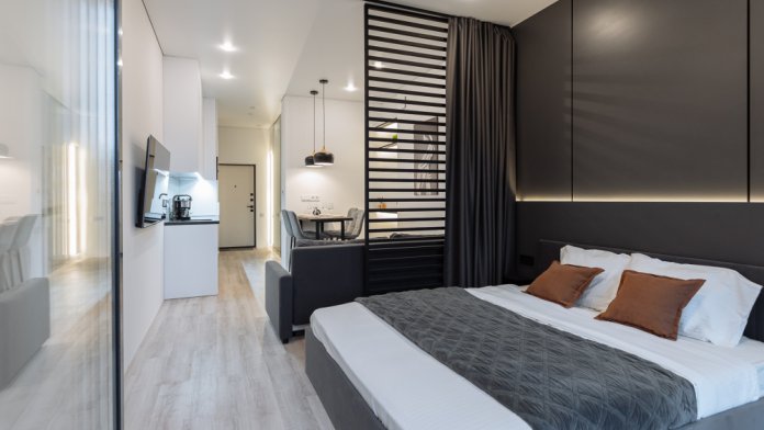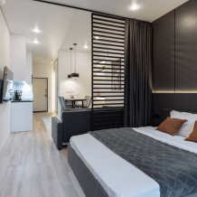 В зоне спальни, закрыв шторку, Вы сможете отдохнуть на большой комфортной кровати с ортопедическим матрасом за просмотром любимых фильмов.