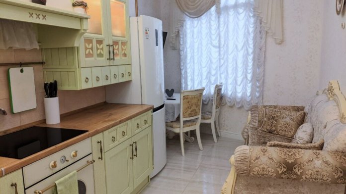 Кухня-гостиная оборудована индукционной плитой с духовкой, вытяжкой, кондиционером, микроволновой печью, холодильником, электрическим чайником, всеми необходимыми кухонными приборами, сковородами, кастрюлями, посудой и столовыми приборами. На кухне стоит диван, который может стать спальным местом для одного человека.