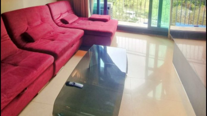 В гостиной стоит 2-спальный диван, телевизор, акустическая система, журнальный столик.