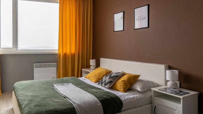 - двуспальная кровать, кухонный гарнитур, обеденный стол, шкаф;