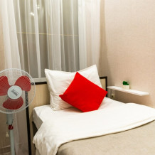 В эконом номере сделан дизайнерский евроремонт и установлена новая современная мебель. Односпальная кровать, модульная мебель. Также в Вашем распоряжении необходимая посуда, полотенца и гигиеничные принадлежности. Холодильник, кулер с горячей и охлажденной водой, столовые и чайные принадлежности с электрическим чайником, СВЧ-печь в общей кухне.