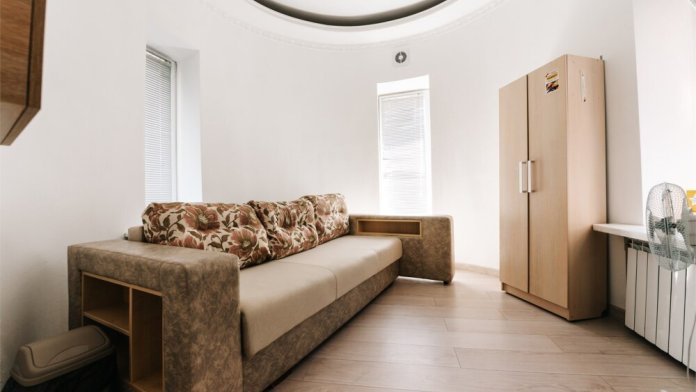 В двухместном эконом номере сделан дизайнерский евроремонт и установлена новая современная мебель. Диван/кровать, ТВ, модульная мебель. Также в Вашем распоряжении необходимая посуда, полотенца и гигиеничные принадлежности. Холодильник, кулер с горячей и охлажденной водой, столовые и чайные принадлежности с электрическим чайником, СВЧ-печь в общей кухне.