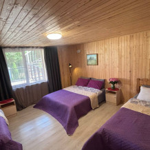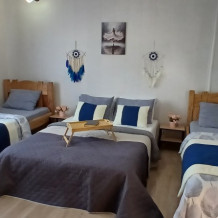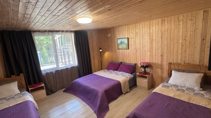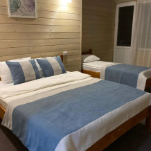 Номер для 4-х человек. В нем расположено две односпальные кровати и двуспальная кровать. Бассейн и завтраки входят в стоимость.