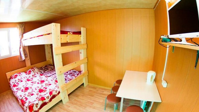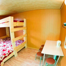 4 местный домик. Двухъярусная кровать. Нижняя 2 на 2 метра, три спальных места. В домике стол, шкаф для посуды и одежды, телевизор, холодильник. Душевая кабина, унитаз, раковина, бойлер горячей воды. Вся посуда для приготовления и употребления пищи. Выдается постельное белье, вентиляторы, обогреватели. Площадь домика 18 кв м.