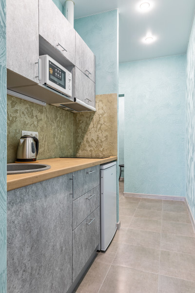 - Стильный кухонный гарнитур со всем необходимым для приготовления любимой домашней еды (техника, кухонные принадлежности, посуда, столовые приборы).