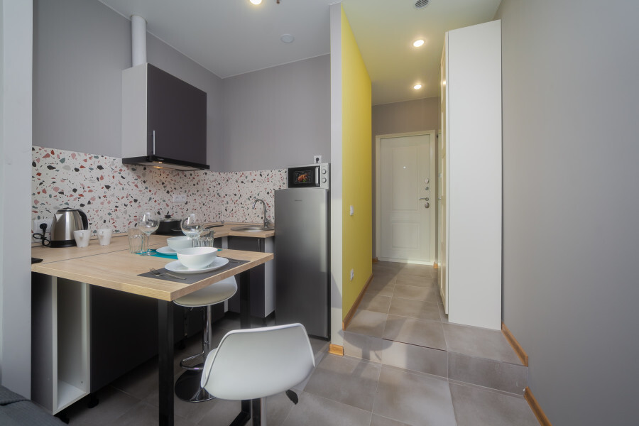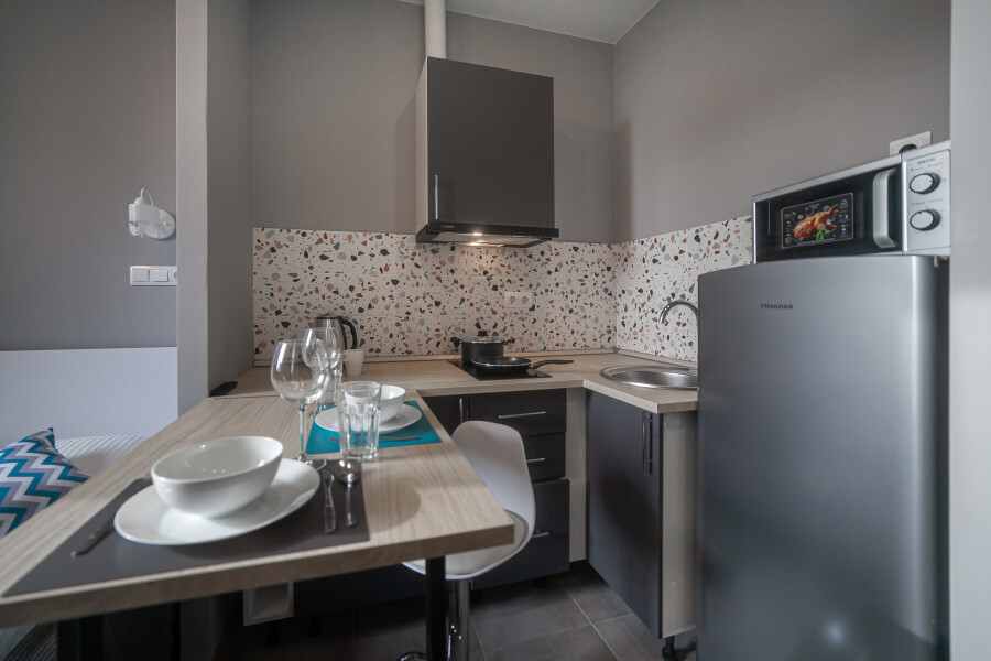 - Стильный кухонный гарнитур со всем необходимым для приготовления любимой домашней еды (техника, кухонные принадлежности, посуда, столовые приборы).