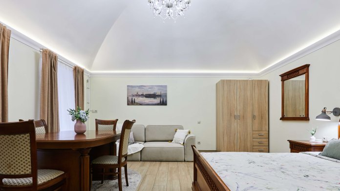 Мы предлагаем в аренду 1-комнатную квартиру с сводчатым потолком. Квартира находится в самом сердце города. Недалеко от нее располагаются Исаакиевский собор, Медный всадник и Александровский сад - одни из главных достопримечательностей города. И, конечно, здесь можно найти множество разных магазинов, ресторанов и пекарен.