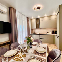 - укомплектованная кухня - гостиная (сплит, кофе - машина, микроволновая печь, посудомоечная машина, стиральная машина, холодильник с морозильной камерой);