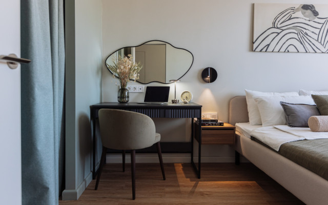 - Полностью оборудованная кухня: холодильник, плита, микроволновка, посудомоечная машина, чайник.