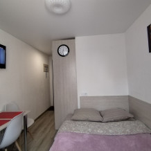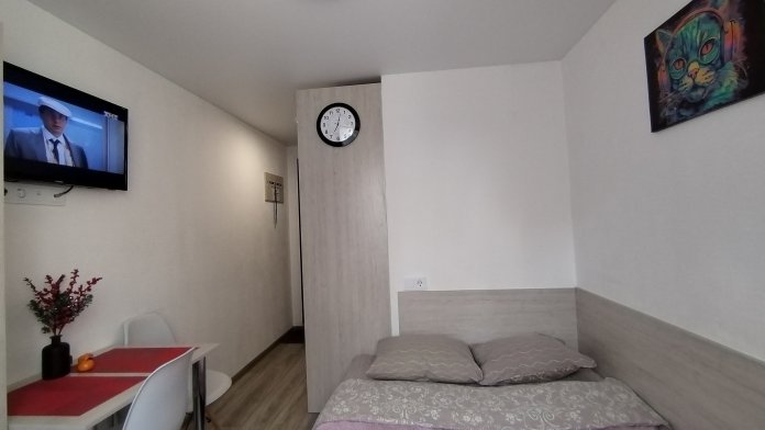 Студия оснащена всем необходимым для проживания: двуспальная кровать; постельное белье, полотенца; кондиционер; полностью укомплектованная кухня (посуда для приготовления и приёма пищи, холодильник, плита, микроволновая печь, электрочайник); фен; кабельное ТВ и Wi-Fi. Стиральная машина, утюг, сушка для белья, гладильная доска находятся в общем коридоре на 4 студии.