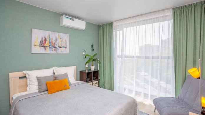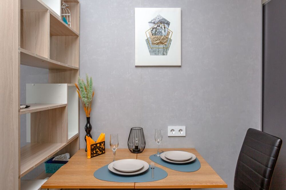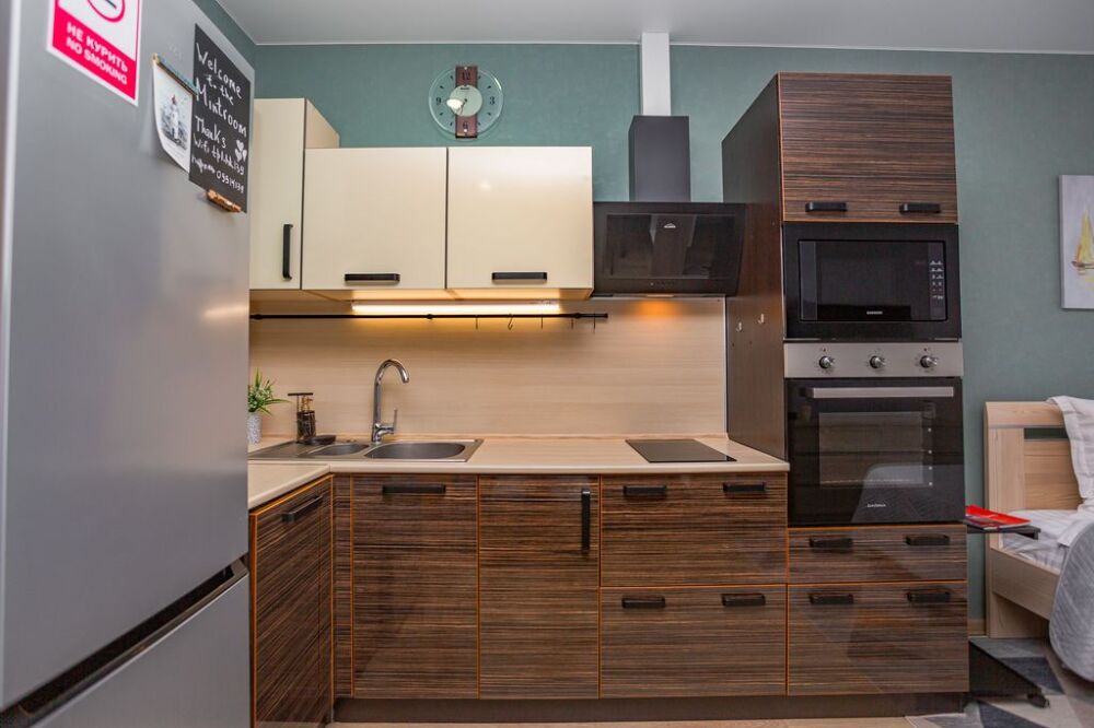 Студия «Mintroom» с панорамными окнами, уютно и со вкусом, бесконтактный заезд в любое время суток, западная сторона, прекрасные закаты и много солнечного света, здесь есть всё необходимое для вашего комфортного пребывания от сушильной машины до зубных щеток и капсул для стирки: