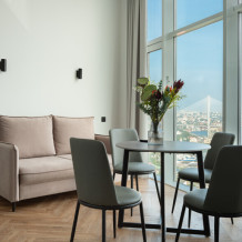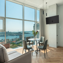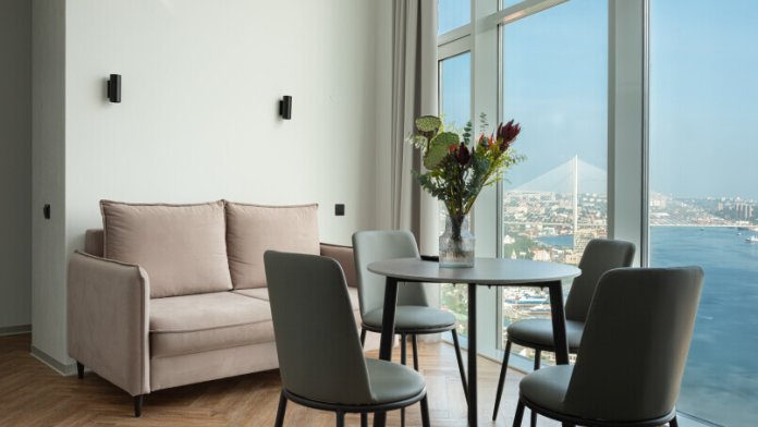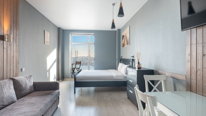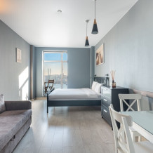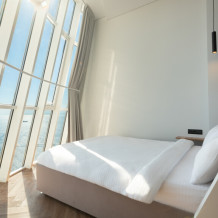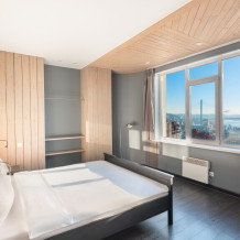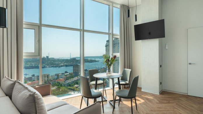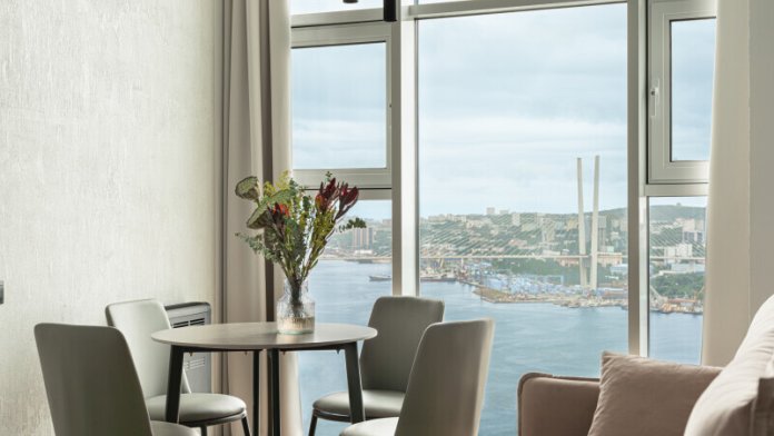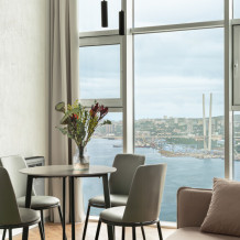 Апартаменты располагаются на высоких этажах, из панорамных окон открывается завораживающий вид на вантовый мост через бухту Золотой рог, мост на остров Русский, Амурский и Уссурийский залив, сам остров Русский, остров Попова, морскую акваторию города у моря!