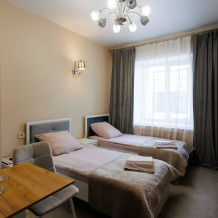 Для размещения предлагаются двухместные номера категории «Стандарт», которые оснащены всем необходимым для качественного отдыха после насыщенного дня. Каждый номер оснащён удобными кроватями со свежим бельём, прикроватными тумбочками, шкафом для бережного хранения вещей. Вечером можно расслабиться перед телевизором за просмотром любимого фильма или сериала. Поддерживать связь с близкими поможет скоростной интернет. Санузел оборудован сантехникой, тапочками, феном, халатами, средствами личной гигиены.