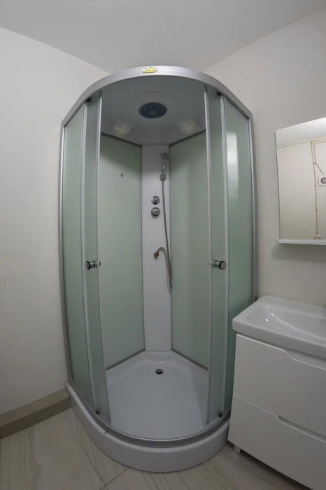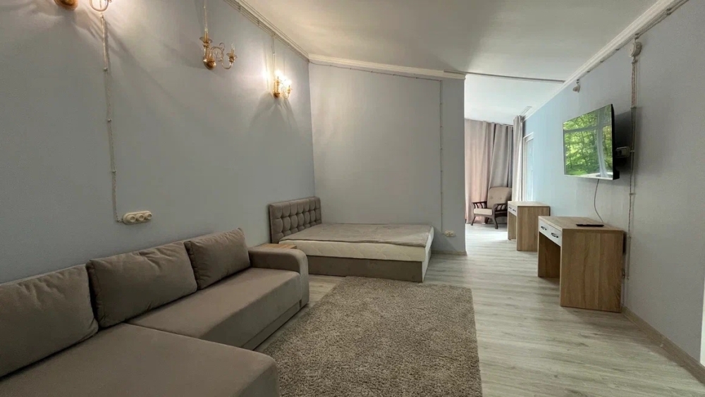 Спальня оснащена двуспальной кроватью 160х200 см, креслом, прикроватной тумбой и столиком с выдвижными ящиками. Во второй комнате - двуспальная кровать 140х200, окно в видом на дубовый лес, столик, диван и телевизор 52 дюйма. В номере большой шкаф с зеркалом в полный рост. Ванная комната оснащена душем. Фен. Махровые халаты.
