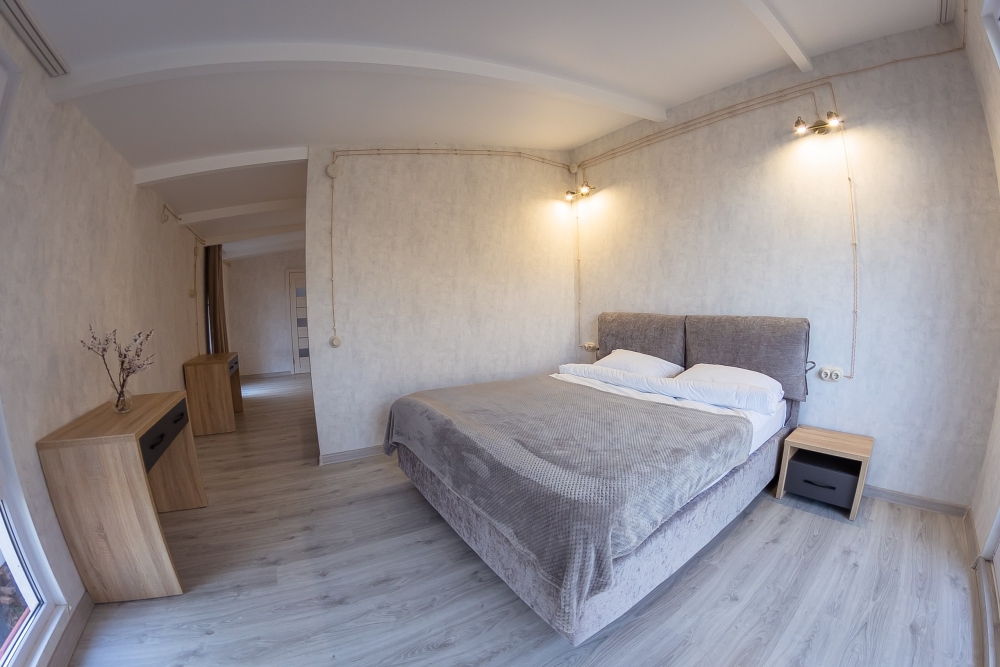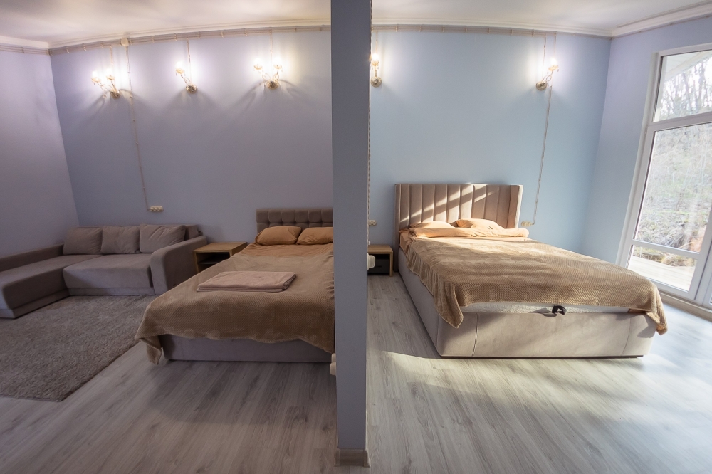 В номере имеется две комнаты в каждой из которых двуспальная кровать. Вторая комната является проходной. Первая комната с выходом на балкон, двуспальная кровать 160х200 см, кресло, прикроватная тумба и столик с выдвижными ящиками. Вторая комната с окно, двуспальная кровать 145х210 см, диван, столик с выдвижными ящиками. В номере отдельный санузел и вместительный шкаф с зеркалом в полный рост. Ванная комната оснащена душем. Фен в каждом номере. 3х разовое питание, Походы в места силы, Психолог, Нутрициолог, Тренер