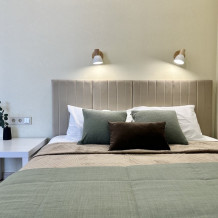 В квартире выполнен дизайнерский ремонт. Комната обставлена стильной мебелью, есть всё необходимое для комфортного проживания: кондиционер, холодильник, телевизор и стиральная машина. Кухня компактная, но функциональная, с площадью 4 кв. м. Санузел совмещённый, с ванной.