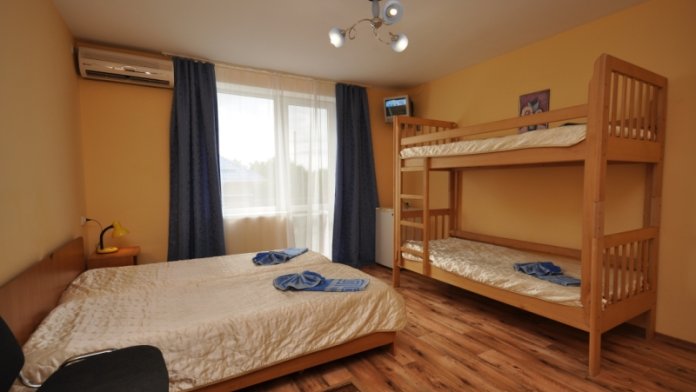 В номере имеется: 2 кровати-трансформера, 2-ярусная кровать; индивидуальный сейф; фен по требованию; необходимая посуда; набор полотенец; гигиенически принадлежности.