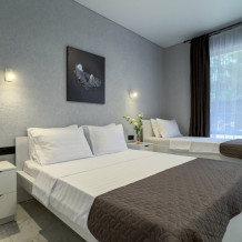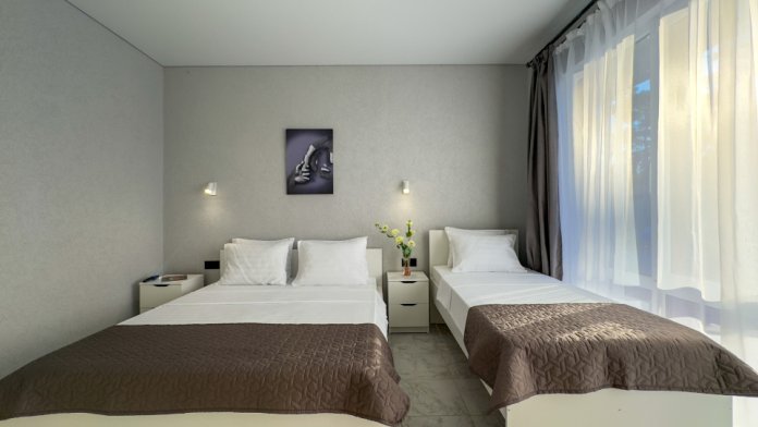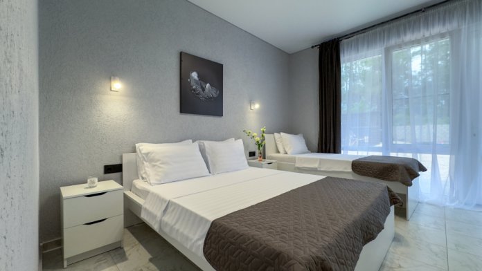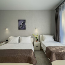 У нас 6 просторных номеров, 4 из которых со своей кухней, 2 стандарта без кухни. В номерах: удобные спальные места (1 двуспальная кровать ( 160*200), 1 односпальная кровать (80*200), дополнительно место евро-раскладушка), кондиционер, телевизор, санузел, мебель, постельное белье.