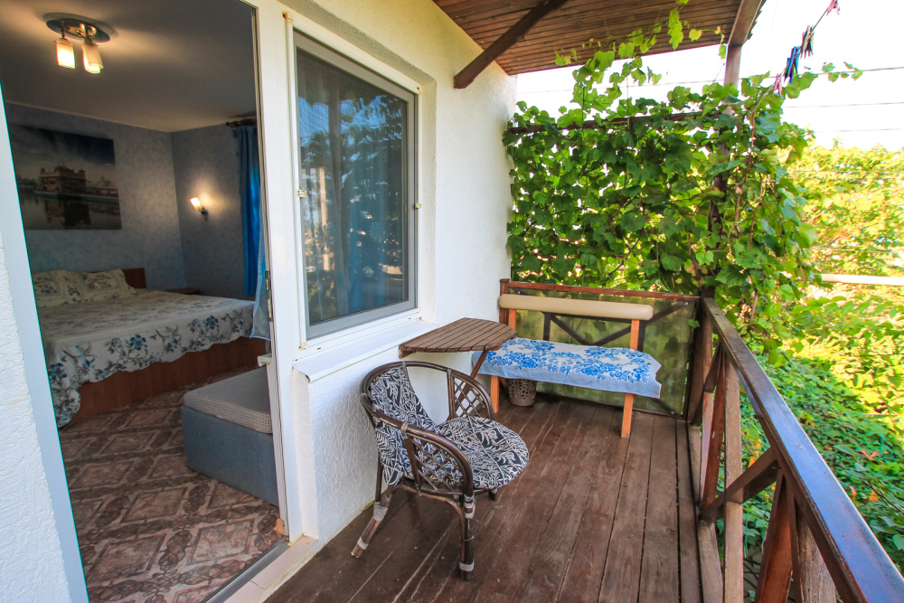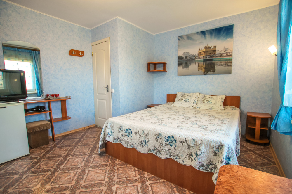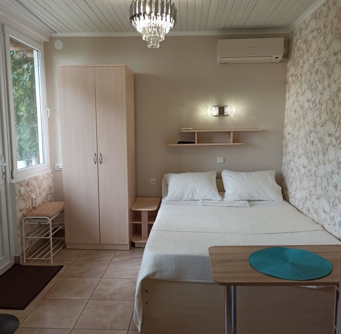 Уютный номер на 4 ех гостей для комфортного отдыха. В стандартную комплектацию номера входит: кондиционер, электрический чайник с чайной посудой, телевизор, холодильник, кровать, диван, тумбочки, шкаф, пуфики, журнальный и туалетный столик. Перед номером личное пространство для отдыха. Санузел с душем. Общая кухня на территории.