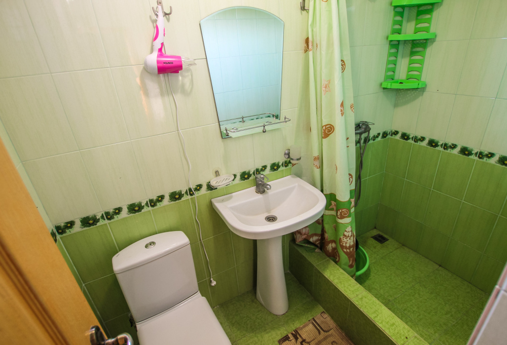 Целый этаж для большой компании. Отдельный вход, свой уютный дворик и кухня с газовой плитой. Две изолированные комнаты. Санузел с душем. В стандартную комплектацию номера входит: кондиционер, телевизор, холодильник, кровати, диван, тумбочки, шкаф, пуфики, журнальный и туалетный столик.