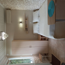 Уютный трехместный номер для Вашего отдыха. Есть 2 номера данной категории имеющие некоторые отличия. В стандартную комплектацию номера входит: телевизор, холодильник, электрический чайник, чайная посуда, кровати, диван, тумбочки, шкаф, пуфики, журнальный и туалетный столик. Перед номером личное пространство для отдыха с садовой мебелью. Общая кухня на территории.
