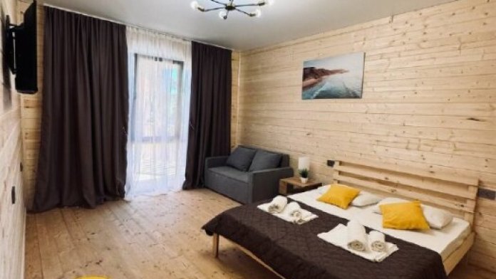 Панорамные окна, наличие большой кровати, диван-кровати.