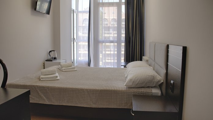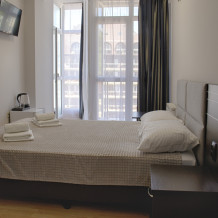 «Стандарт» с балконом. Располагается на 2-3-4-5 этажах, вид во двор и на город. Сплит-система, мини-холодильник, LED телевизор. Удобные кровати: двуспальная кровать(основное размещение), прикроватные тумбочки, столик с зеркалом, шкаф. Санузел в номере.