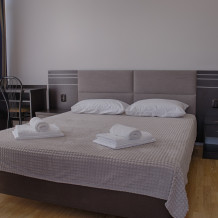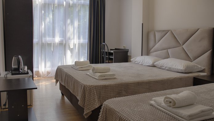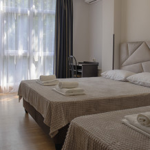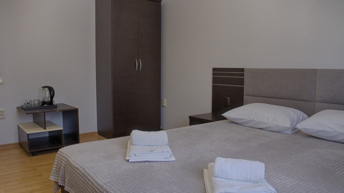 «Семейный» 2-х комнатный номер с балконом располагается на 2-3-4-5 этажах, вид во двор на бассейн. Две раздельные комнаты. Сплит-система, холодильник, 2 LED телевизора. Удобные кровати: две двуспальные (основное размещение) и односпальная кровать, и двуспальный диван (дополнительное размещение), прикроватные тумбочки, столик с зеркалом, шкаф. Санузел в номере.