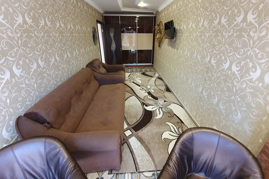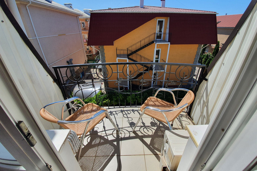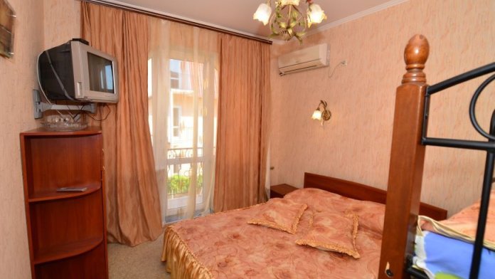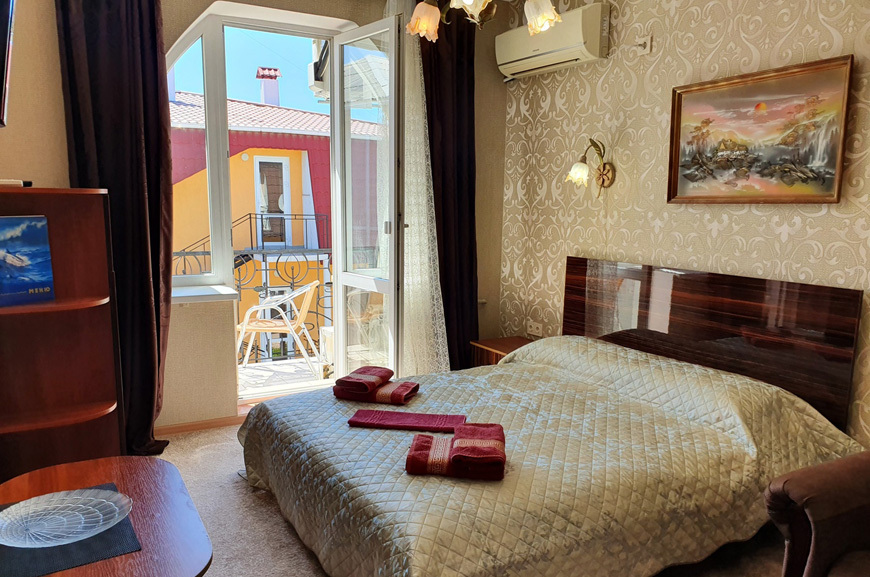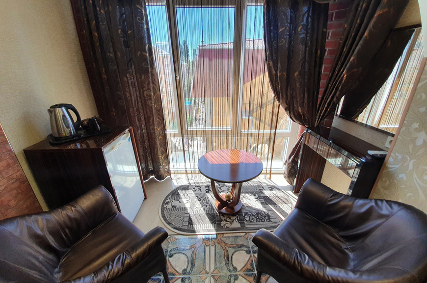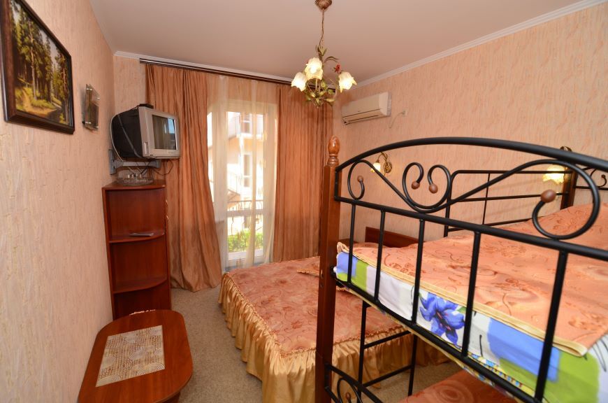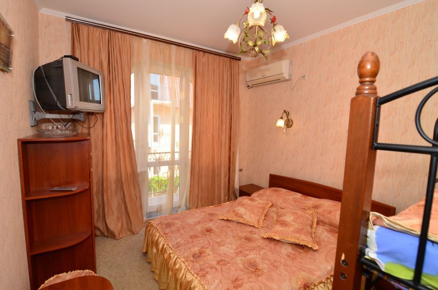 В номере: кровать двуспальная или 2 односпальные, прикроватные тумбочки, мягкое кресло, столик, 2 стула, шкафчик, комплект полотенец, мыльные принадлежности, бойлер, ТВ 95 каналов, смена белья 1 раз в неделю.