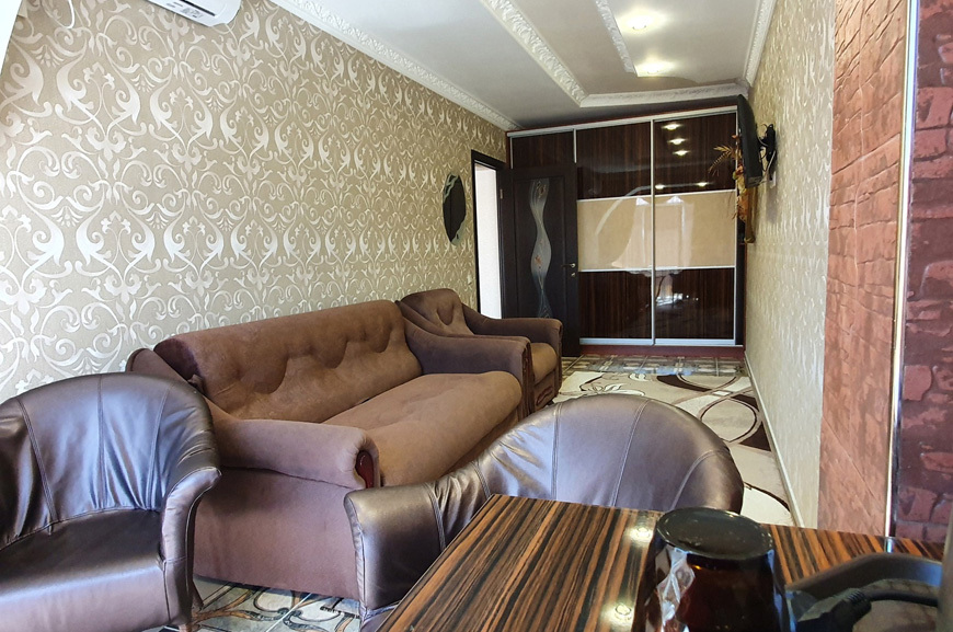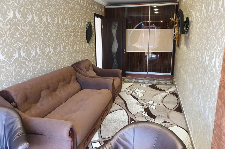 Во второй комнате есть раскладные диван и кресла, столик, шкаф для одежды, холодильник, спутниковое ТВ с 95 каналами, кондиционер. Из этой комнаты можно выйти на балкон.