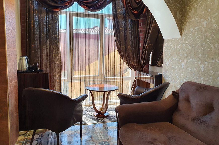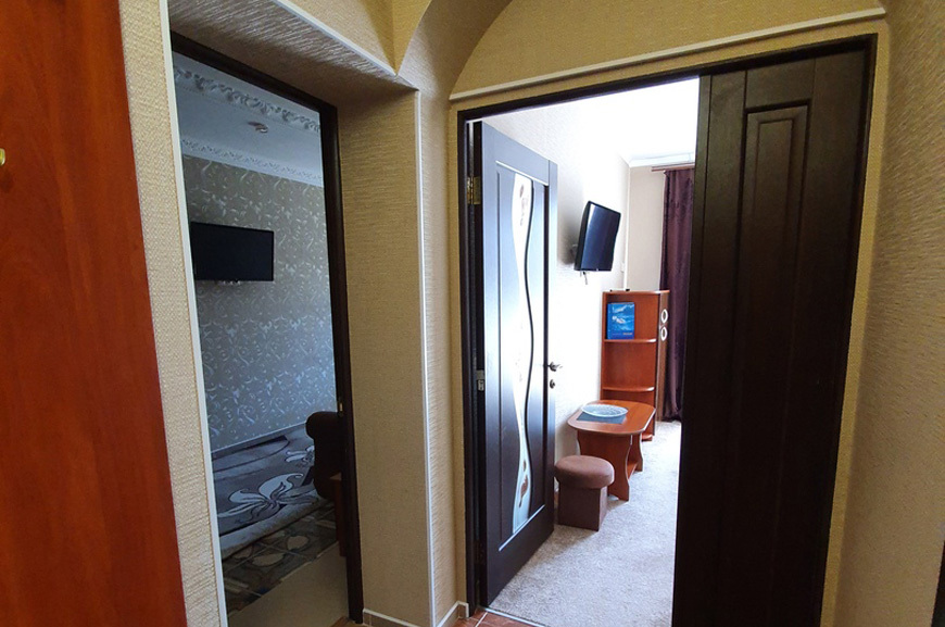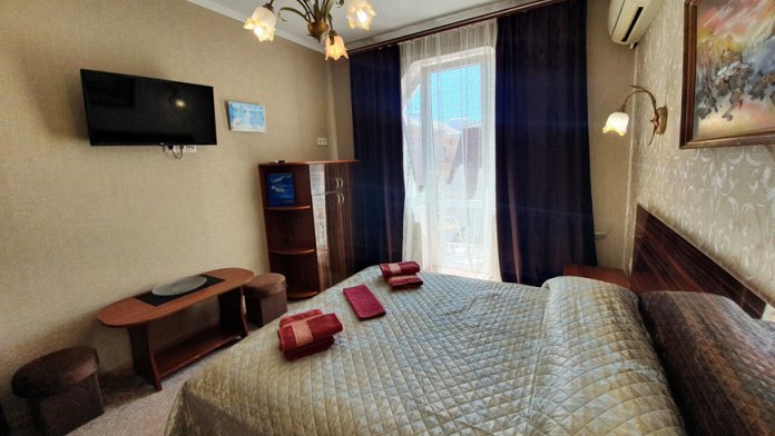 В номере: прикроватные тумбочки, шкаф для одежды с зеркалом, туалетный столик, комод, мягкое кресло, столик, пуфик, шкаф, санузел оборудован современной сантехникой с душевой кабиной, теплую воду обеспечивает бойлер, комплект полотенец, мыльные принадлежности; смена постельного белья 1 раз в неделю.