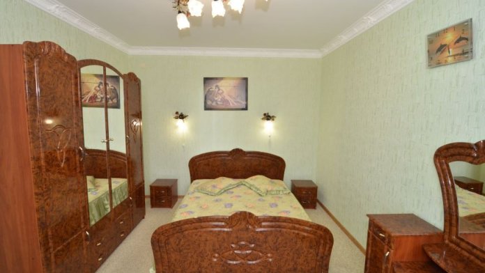 В номере: прикроватные тумбочки, шкаф для одежды с зеркалом, туалетный столик, комод, мягкое кресло, столик, пуфик, шкаф, санузел оборудован современной сантехникой с душевой кабиной, теплую воду обеспечивает бойлер, комплект полотенец, мыльные принадлежности; смена постельного белья 1 раз в неделю.