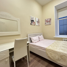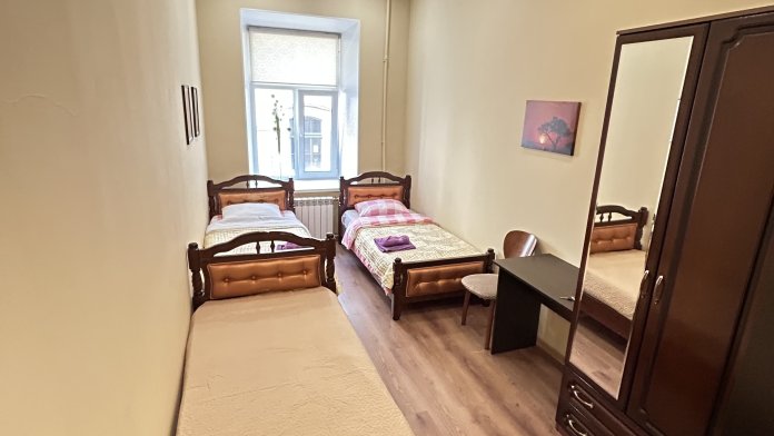 Комната оснащена двуспальной кроватью 160*200 и односпальной кроватью 80х200, письменным столом, шкафом для одежды. Размещение до трех человек.