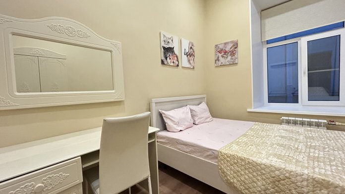 Двухместные комнаты оснащены двуспальными кроватями 140х200, письменным столом, шкафом для одежды.
