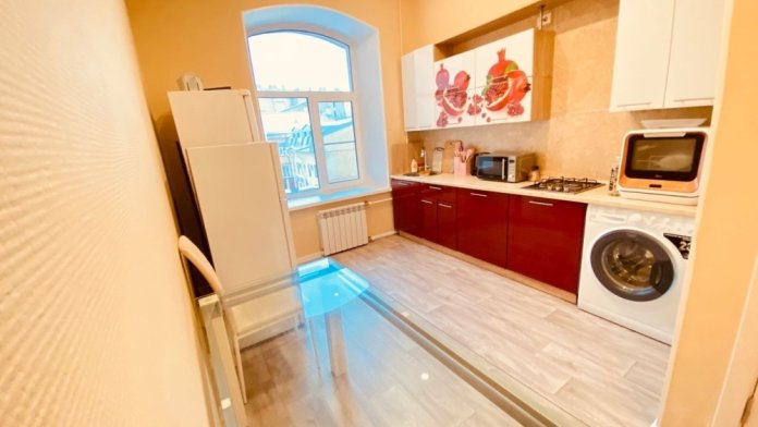 Общая, просторная кухня с двумя холодильниками, две душевых и один санузел в общем пользовании.