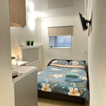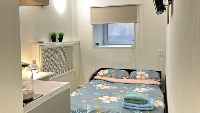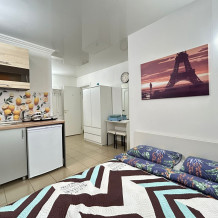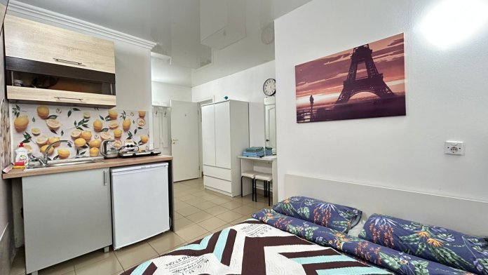 Номер с собственным санузлом и кухней. Посуда, фен, утюг, постельные принадлежности и полотенца, шампунь, гель и чай есть все для спокойного отдыха.