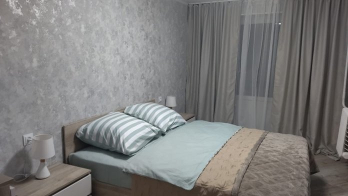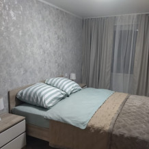 Квартира расположена на 8 этаже (есть лифт), состоит из 3 спален и кухни, укомплектованной всей необходимой техникой и посудой, ванной комнаты. Спальня с 2-х спальней кроватью, детская с раскладным диваном и рабочей зоной, гостиная - раскладной диван.