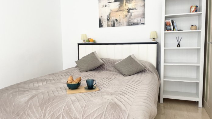 Полноценная спальная комната с двуспальной кроватью с ортопедическим матрасом (160x200см), рабочей зоной, Smart TV 43 дюйма и множеством каналов.