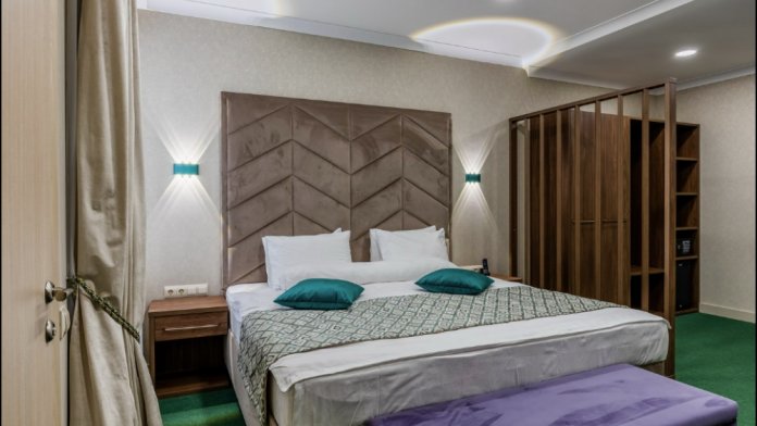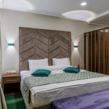 Номер отлично подойдет для семейных пар, желающих действительно отдохнуть в нашем городе - окна, выходящие во внутренний дворик, обеспечат Вас тишиной на протяжении всего проживания. Ключевой особенностью Вашего номера является наличие личной сауны прямо в номере. Визуально номер разделен на зону отдыха с удобным диваном (который можно использовать в качестве дополнительного места) и зону для сна с роскошной двуспальной кроватью. В номере премиальная косметика и халаты, мы предоставим Вам чайную станцию и капсульную кофемашину - Вы сможете пить чай и кофе, не покидая номера.