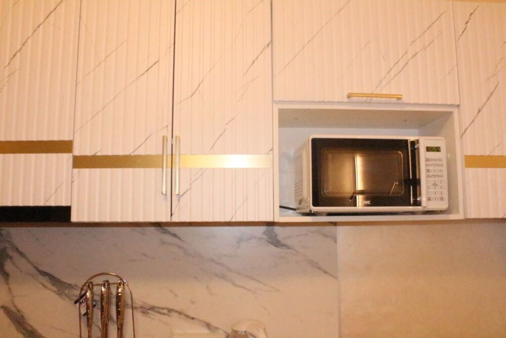 Кухонное оборудование: плита, микроволновка, посуда и принадлежности, столовые приборы, электрический чайник, обеденный стол, турка для приготовления кофе, чай/кофе, телевизор.