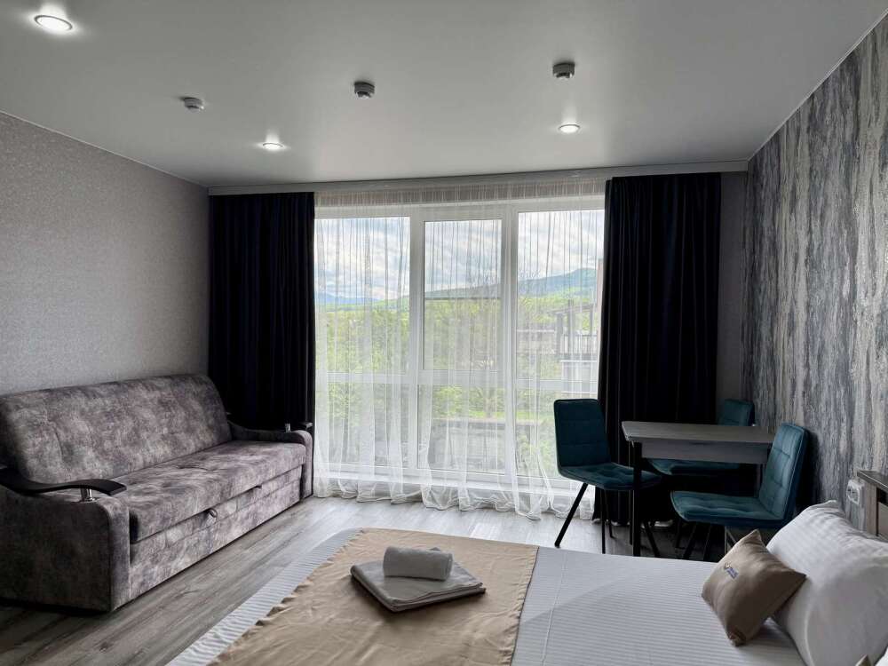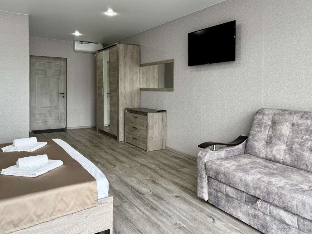 — Просторная двуспальная кровать и раскладной диван — Собственная ванная комната с душем, феном и бесплатными косметическими принадлежностями — Телевизор, холодильник, сплит-система, чайник, стол, стулья, прикроватные тумбочки, шкаф — Ламинат, современный интерьер, панорамные окна в пол