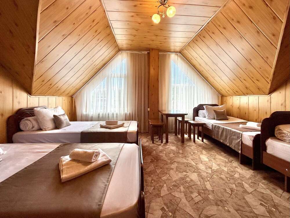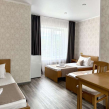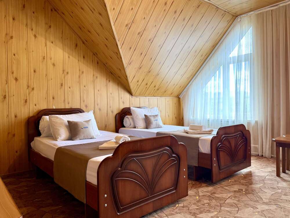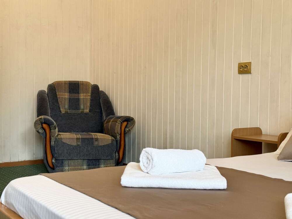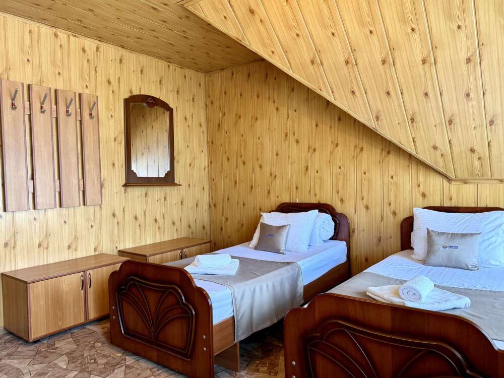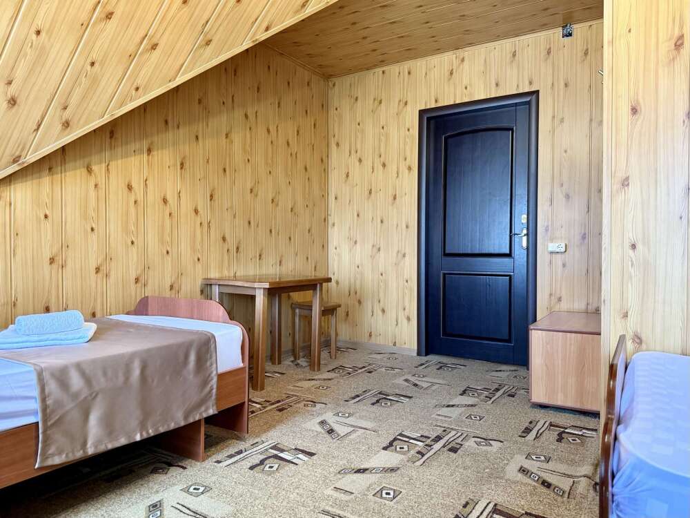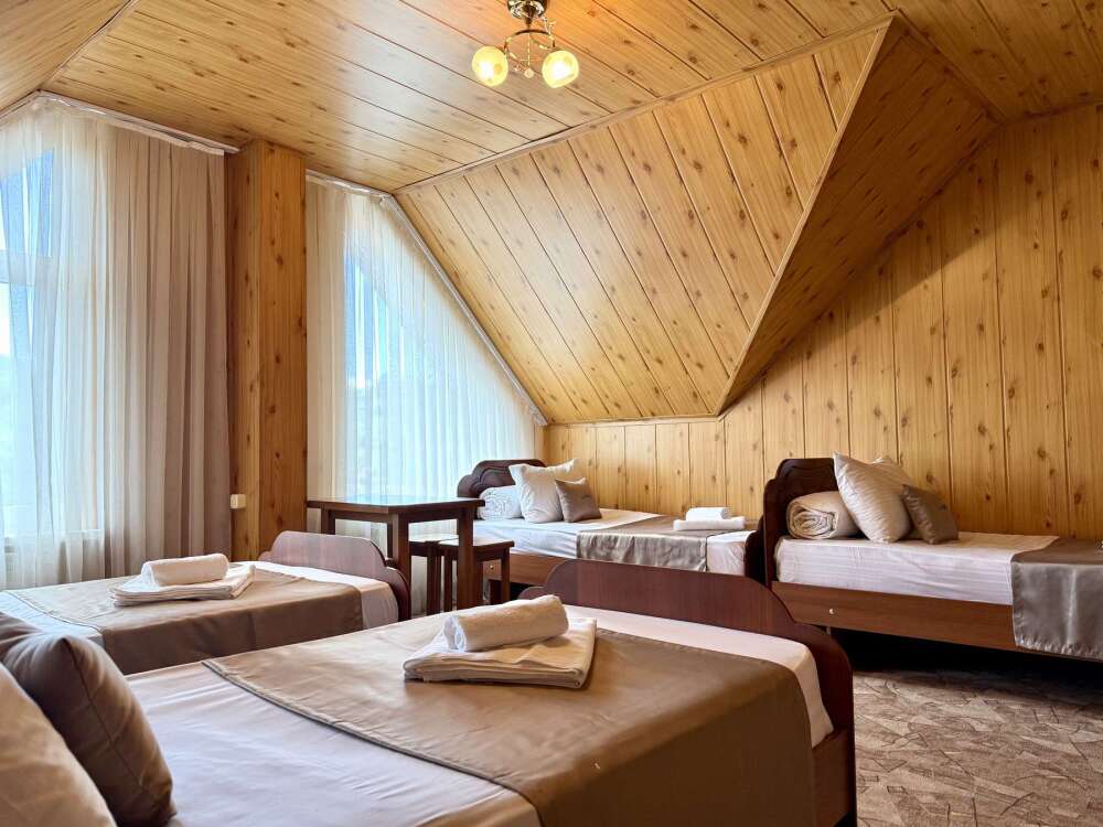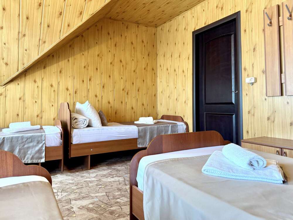 Уютная комната с доступом к общему балкону — для ценителей простоты и уюта. Комната с четырьмя односпальными кроватями, где после активного дня на природе вы окунётесь в тишину и отдых. Интерьер продуман до мелочей: есть комод, зеркало, вешалка — всё необходимое для комфортного пребывания.