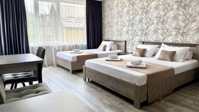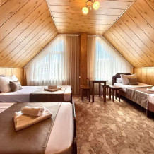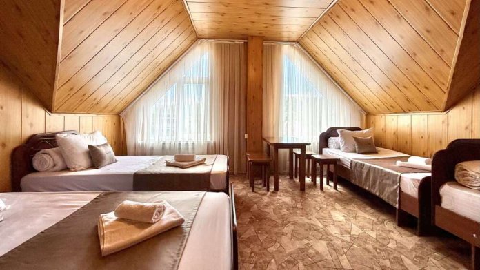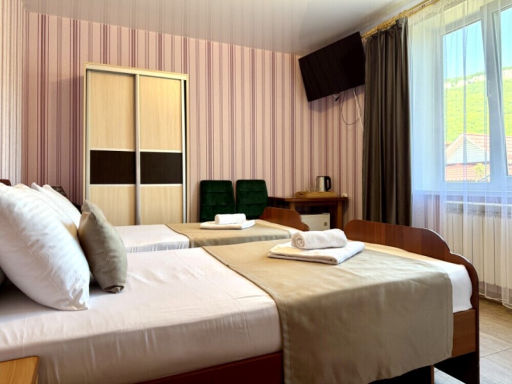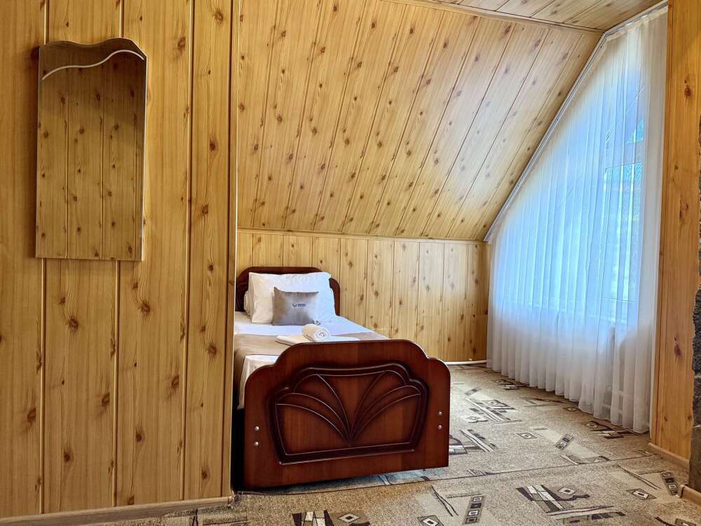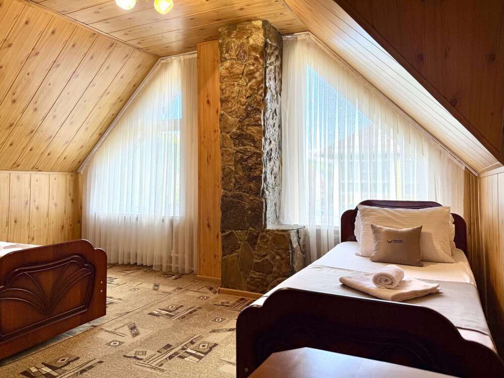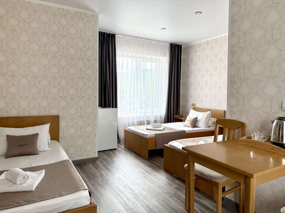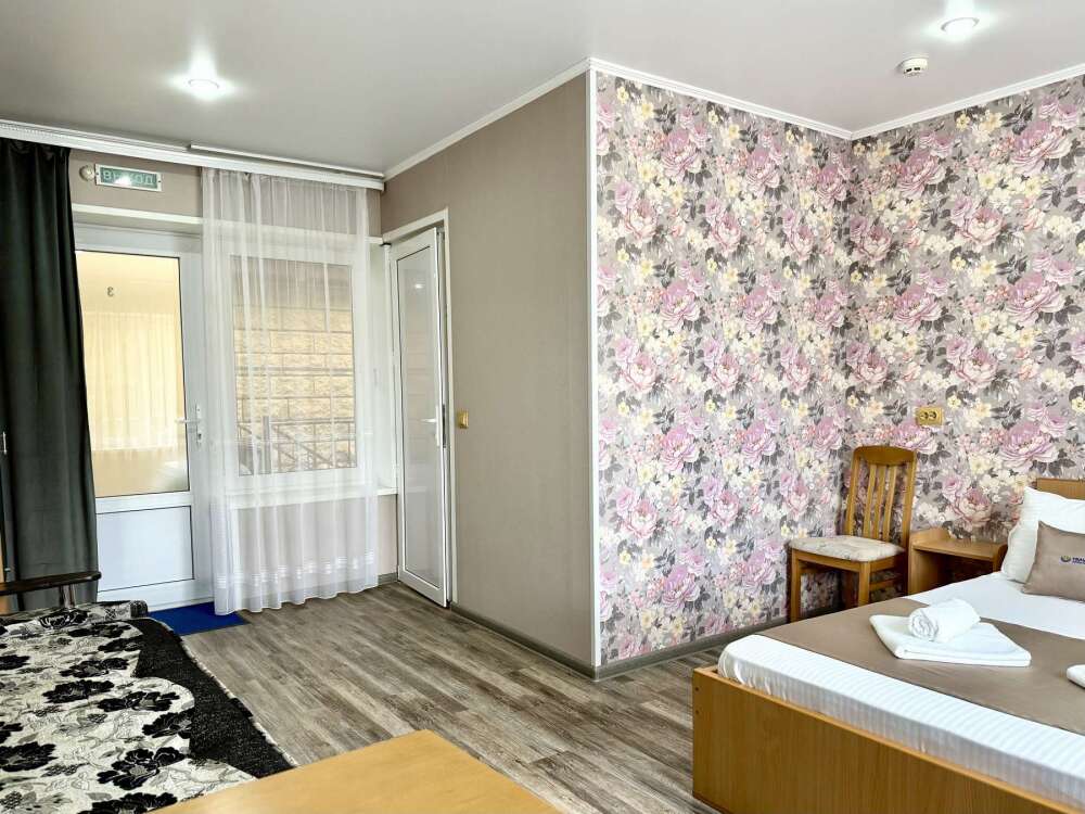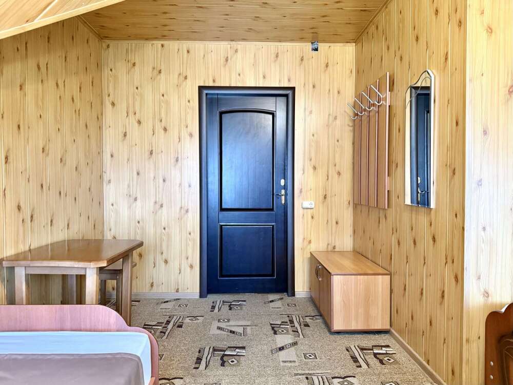Уютная комната с доступом к общему балкону — для ценителей простоты и уюта. Комната с четырьмя односпальными кроватями, где после активного дня на природе вы окунётесь в тишину и отдых. Интерьер продуман до мелочей: есть комод, зеркало, вешалка — всё необходимое для комфортного пребывания.