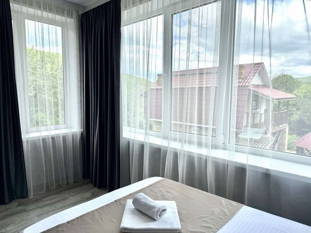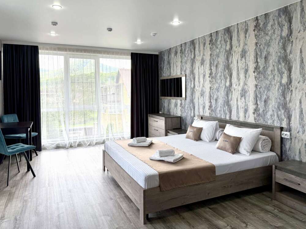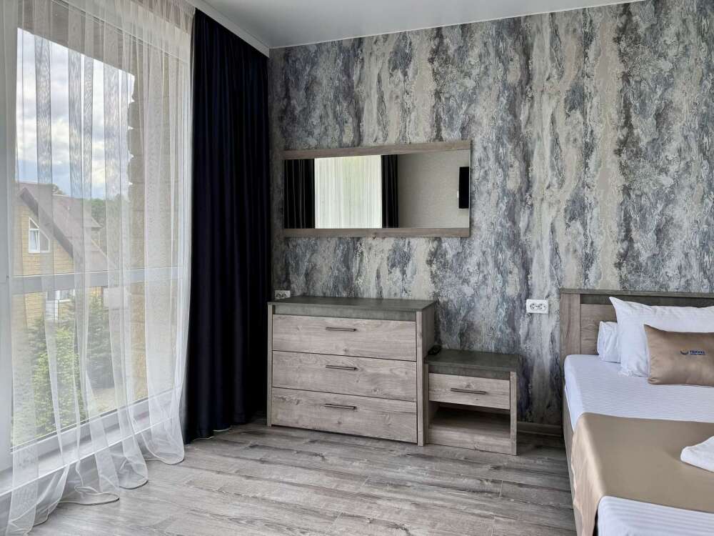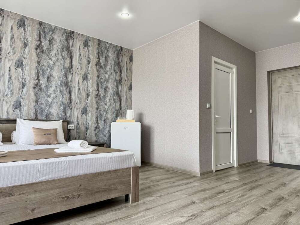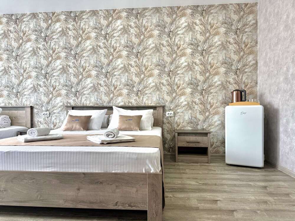 — Просторная двуспальная кровать и односпальная кровать — Собственная ванная комната с душем, феном и бесплатными косметическими принадлежностями — Телевизор, холодильник, сплит-система, чайник, стол, стулья, прикроватные тумбочки, шкаф — Ламинат, современный интерьер, панорамные окна в пол