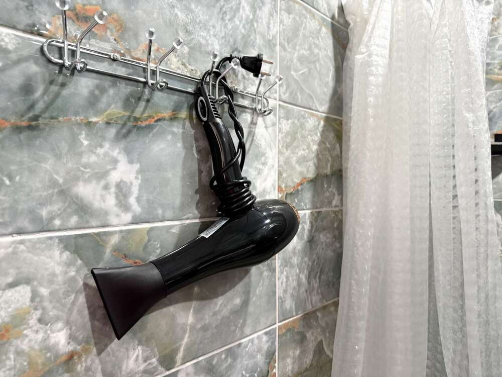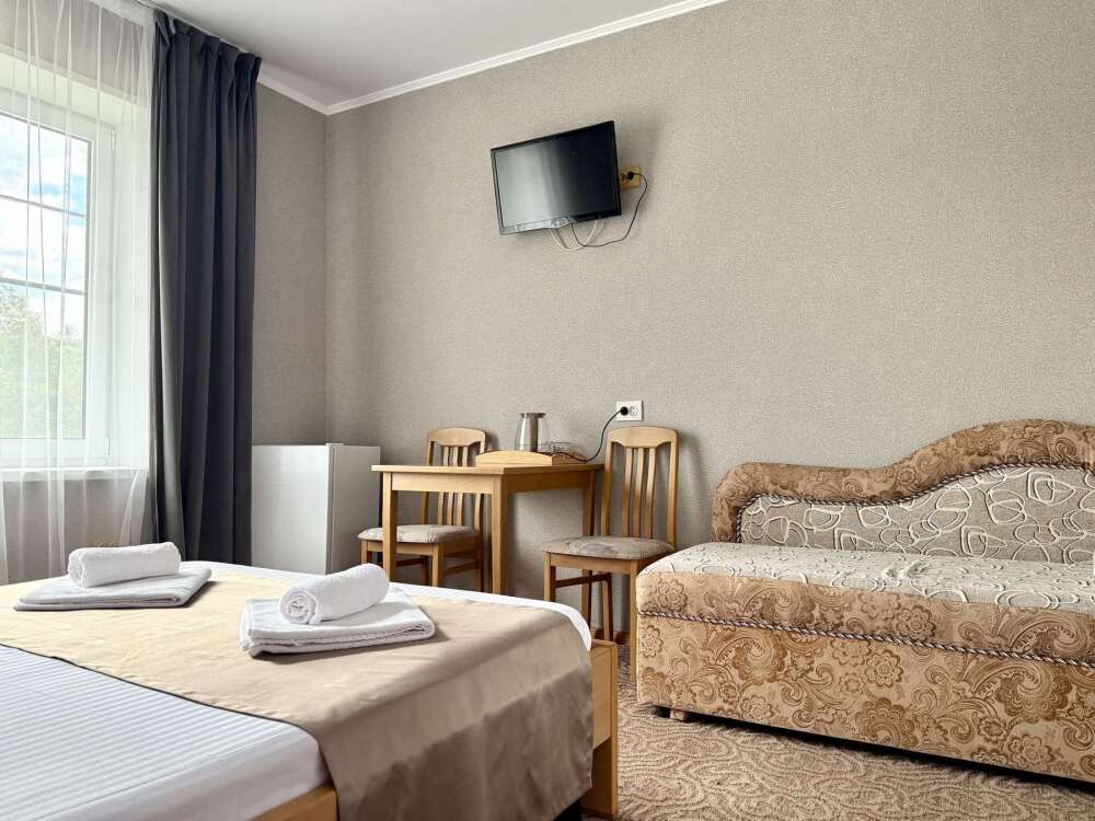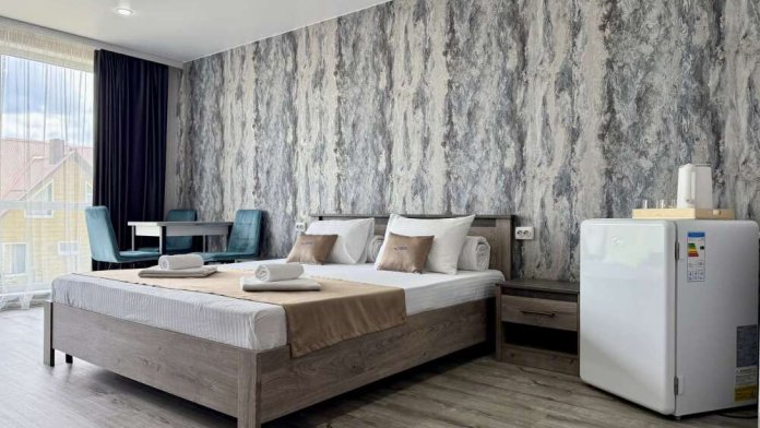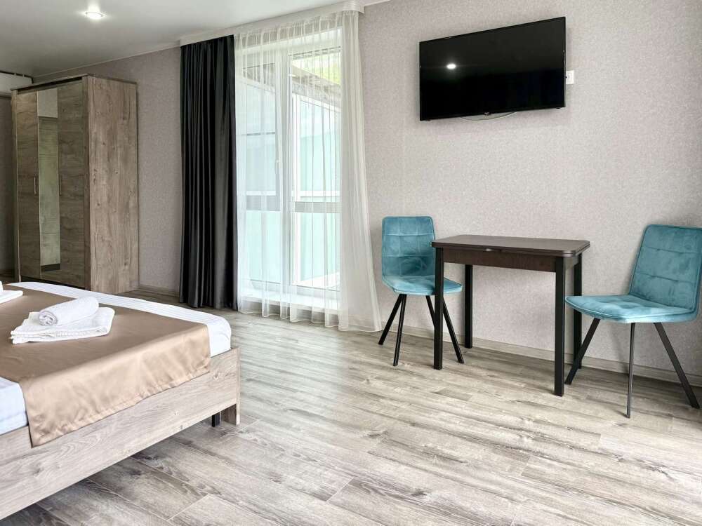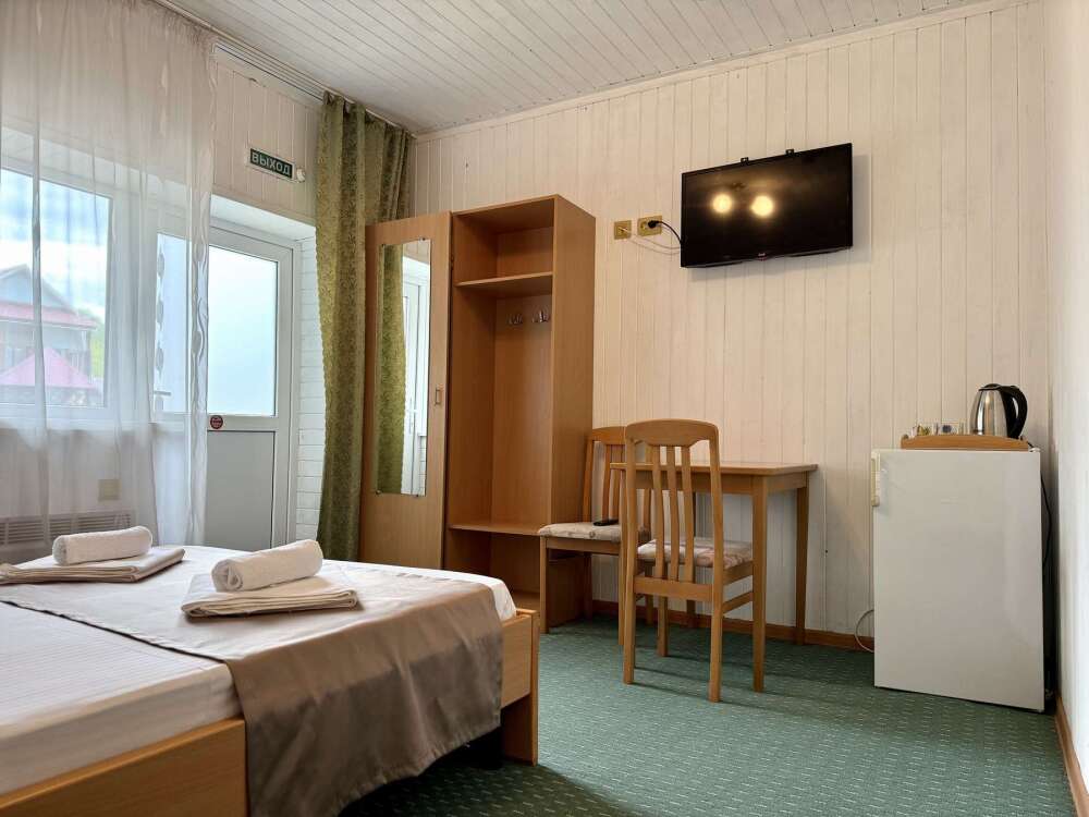 — Двуспальная кровать — Собственная ванная комната с душевой кабинкой и тёплым полом, бесплатные косметические принадлежности — Телевизор, холодильник, чайник, стол, стулья, шкаф — Ковролин или плитка, нейтральный интерьер.