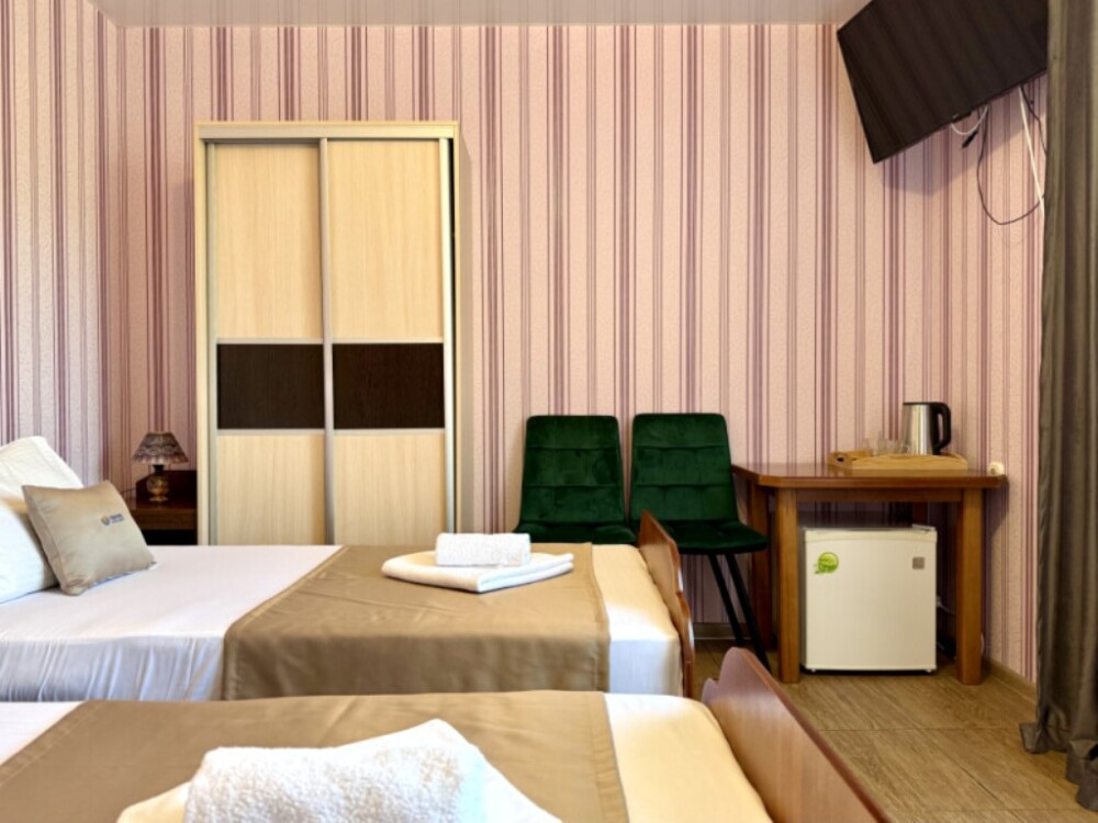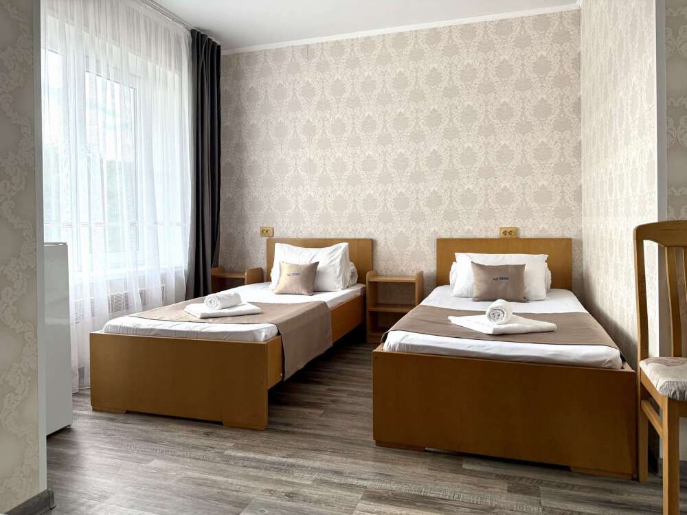 — Две односпальные кровати — Собственная ванная комната с душевой кабиной и бесплатными косметическими принадлежностями — Телевизор, холодильник, чайник, стол, стулья, шкаф — Плитка, нейтральный, не перегружающий интерьер