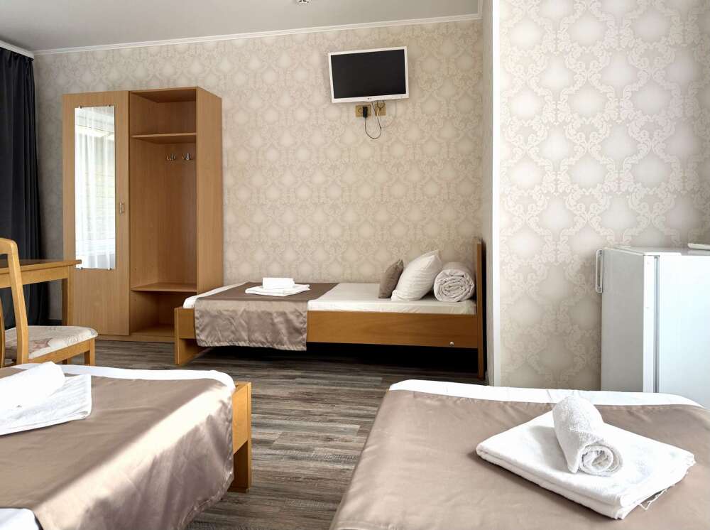 — Три односпальные кровати — Собственная ванная комната с душевой кабинкой и тёплым полом, бесплатные косметические принадлежности — Телевизор, холодильник, чайник, стол, стулья, шкаф — Ламинат, нейтральный интерьер, общий балкон
