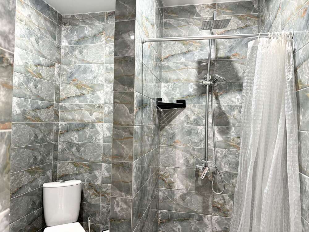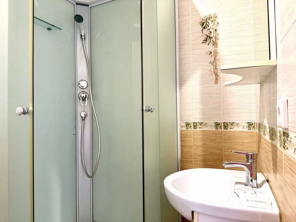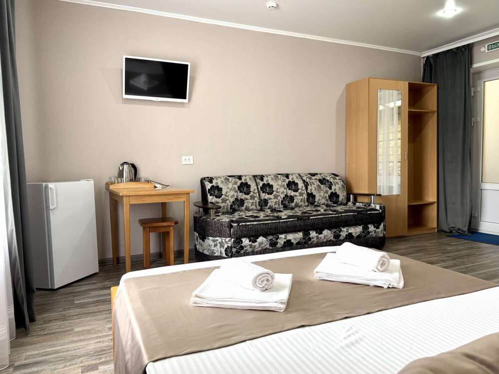 — Двуспальная кровать и раскладной диван — Собственная ванная комната с душевой кабинкой и тёплым полом, бесплатные косметические принадлежности — Телевизор, холодильник, чайник, стол, стулья, шкаф, торшер — Ламинат или плитка, нейтральный интерьер, общий или индивидуальный балкон