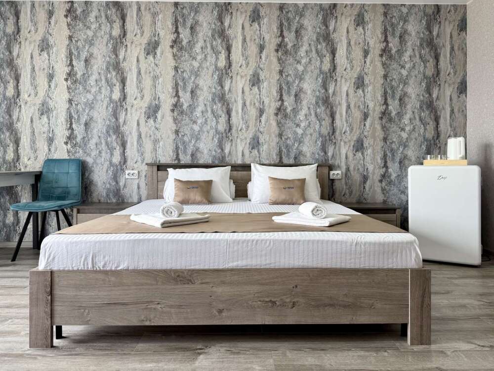 — Просторная двуспальная кровать — Собственная ванная комната с душем, феном и бесплатными косметическими принадлежностями — Телевизор, холодильник, сплит-система, чайник, стол, стулья, прикроватные тумбочки, шкаф — Ламинат, современный интерьер, панорамные окна в пол