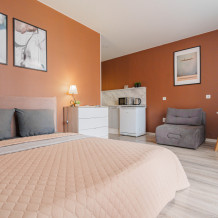 - кухня: холодильник, варочная панель, СВЧ печь, электрический чайник, а также весь необходимый комплект посуды и столовых приборов;